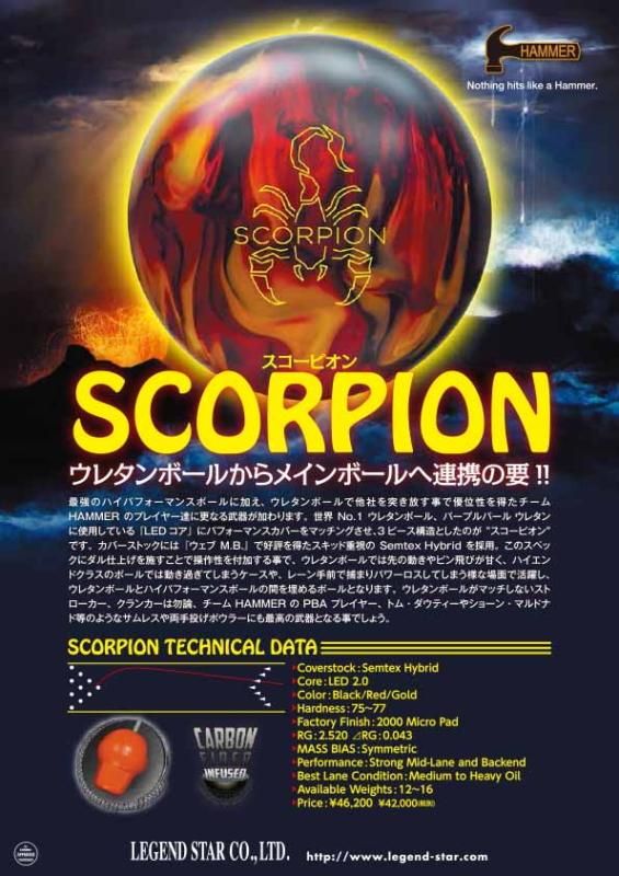 最強のハイパフォーマンスボールに加え、ウレタンボールで他社を突き放す事で優位性を得たチームHAMMERのプレイヤー達に更なる武器が加わります。世界No.1ウレタンボール、パープルパール ウレタンに使用している『LEDコア』にパフォーマンスカバーをマッチングさせ、3ピース構造としたのが“スコーピオン”です。カバーストックには『ウェブM.B.』で好評を得たスキッド重視のSemtex Hybridを採用。このスペックにダル仕上げを施すことで操作性を付加する事で、ウレタンボールでは先の動きやピン飛びが甘く、ハイエンドクラスのボールでは動き過ぎてしまうケースや、レーン手前で捕まりパワーロスしてしまう様な場面で活躍し、ウレタンボールとハイパフォーマンスボールの間を埋めるボールとなります。ウレタンボールがマッチしないストローカー、クランカーは勿論、チームHAMMERのPBAプレイヤー、トム・ダウティーやショーン・マルドナド等のようなサムレスや両手投げボウラーにも最高の武器となる事でしょう。