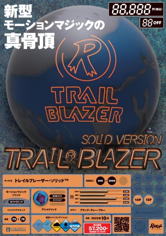 しかし、この「トレイルブレーザー・ソリッド」に採用されているカバーストック「モーションマジック・ソリッド」においては、ベースマテリアルからの再調整を行い、全く違った風合いを感じさせるほどのオイルに対するキャッチ力と中間部分でのパワーロスを最小限にとどめるスキッド力、そして、これまでに感じられたことの無いようなアグレッシブさを感じるバックエンドモーションを有し、トータルのボールパフォーマンスとしては、他のものと一線を画す仕上がりとなっております。