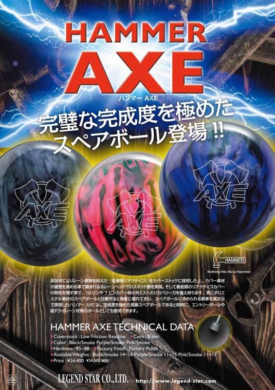添加材によりレーン摩擦を抑えた『低摩擦リアクティブ』をカバーストックに採用した上、カバー素材の硬度を高める事で類まれなるレーンヘッドでのスキッド感を実現。そして最低限のリアクティブカバーの特性を残す事で、10ピンや7ピンカバー時の外ミスへのリカバリー力を備え持ちます。更にポリエステル素材のスペアボールと比較すると強度に優れており、スペアボールに求められる要素を高次元で実現したハンマー AXEは、完成度を極めた高級スペアボールであると同時に、エントリーボールや超ドライレーン対策のボールとしても使用できます。