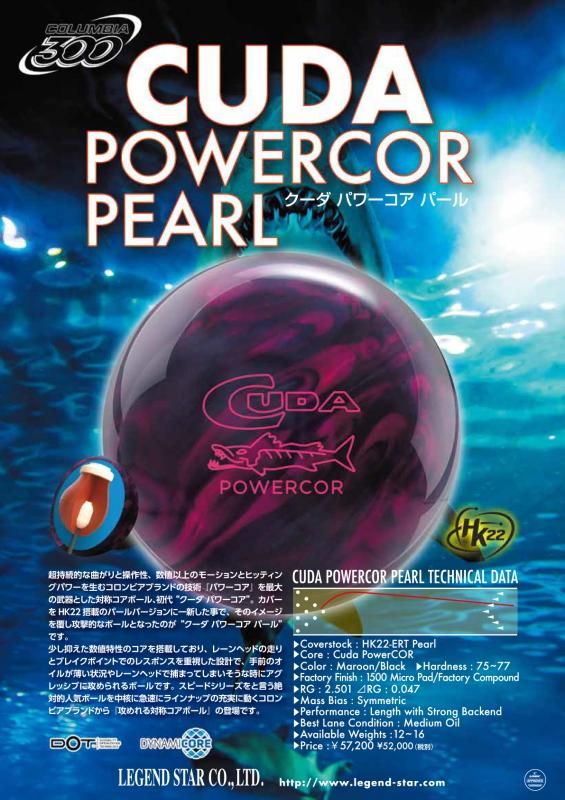 超持続的な曲がりと操作性、数値以上のモーションとヒッティングパワーを生むコロンビアブランドの技術『パワーコア』を最大の武器とした対称コアボール、初代“クーダ パワーコア”。カバーをHK22搭載のパールバージョンに一新した事で、そのイメージを覆し攻撃的なボールとなったのが“クーダ パワーコア パール”です。少し抑えた数値特性のコアを搭載しており、レーンヘッドの走りとブレイクポイントでのレスポンスを重視した設計で、手前のオイルが薄い状況やレーンヘッドで捕まってしまいそうな時にアグレッシブに攻められるボールです。スピードシリーズをと言う絶対的人気ボールを中核に急速にラインナップの充実に動くコロンビアブランドから『攻めれる対称コアボール』の登場です。