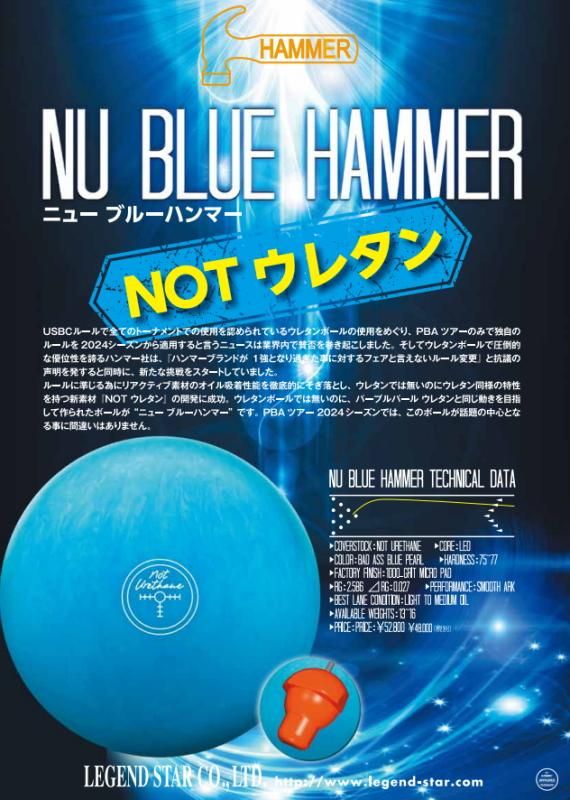 ルールに準じる為にリアクティブ素材のオイル吸着性能を徹底的にそぎ落とし、ウレタンでは無いのにウレタン同様の特性を持つ新素材「NOTウレタン」の開発に成功。ウレタンボールでは無いのに、パープルパールウレタンと同じ動きを目指して作られたボールがニューブルーハンマーです。PBAツアー2024シーズンでは、このボールが話題の中心となる事に間違いはありません。