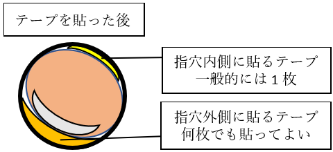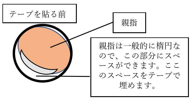 一般的に人の親指の形は楕円で、横幅の方が広くなります。そこで一般的にはサムホールのサイズは親指の横幅に合わせて測ります。ドリルした指穴は丸いため、ボールを握った時に親指の背中側にはスペースができます。そこでそのスペース部分にテープを貼って調整する必要があります。親指の楕円具合にもよりますが通常、5枚~10枚くらいはテープを張る必要があります。また、指紋側には滑りにくいテープを貼ることが一般的です。