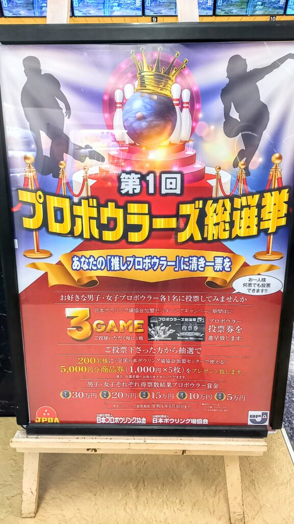 今年の6月末までの開催予定で、3ゲーム投球する毎に1枚ゲットできる投票券を、お好きな男子プロ・女子プロの名前をそれぞれ書いて(お客様の連絡先とかも)投票するだけで、抽選でボウリングで使える商品券が当たっちゃう!なイベントです。