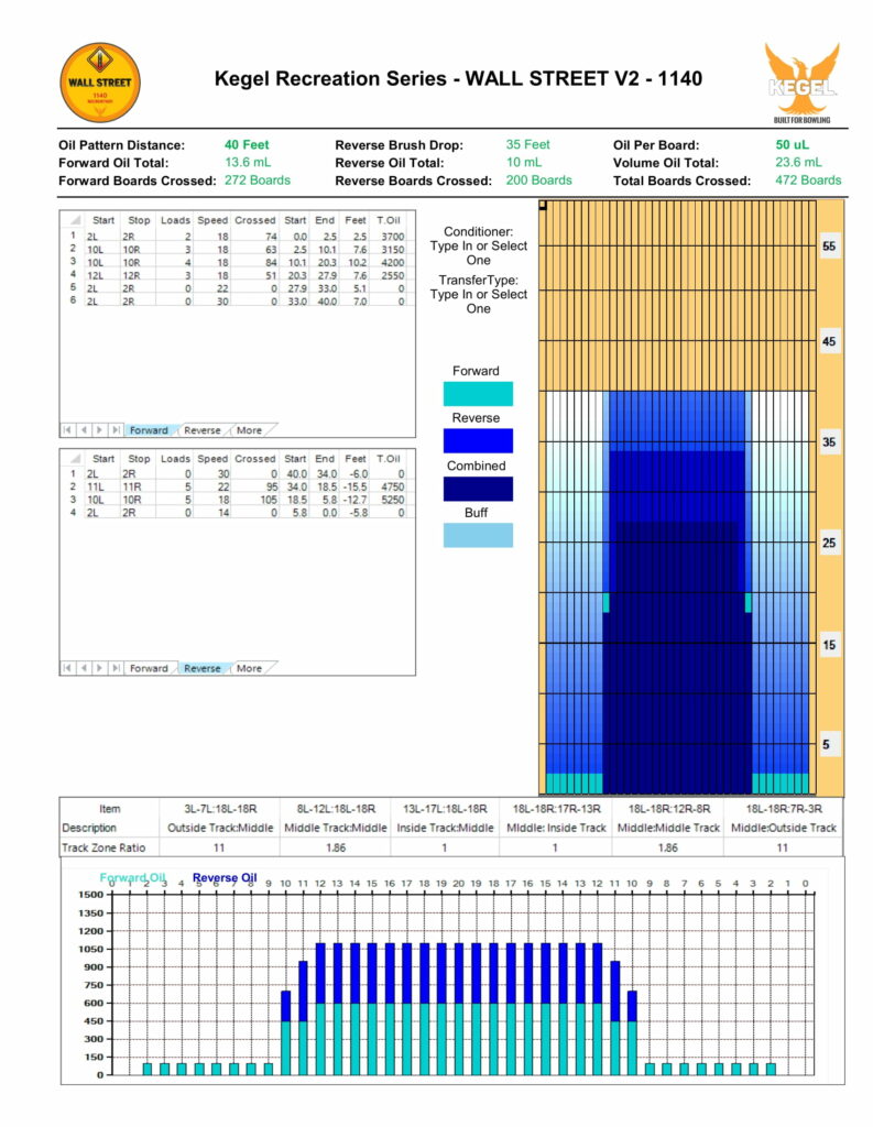 これにはオイルの量、何フィート迄散布されているか、外と真ん中のオイル量の対比等レーンを攻略する際に重要な情報がすべて記載されております。これを基に投げるライン、使用するボール等様々な作戦を立てて選手は試合に挑む事が多いです